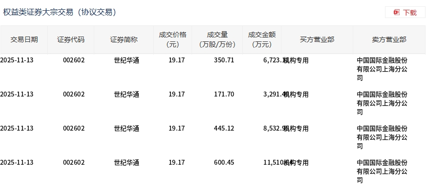 11月13日,世纪华通大宗交易成交1567.98万股,成交额3.01亿元,占当日总成交额的4.42%,成交价19.17元,较市场收盘价19.17元持平。