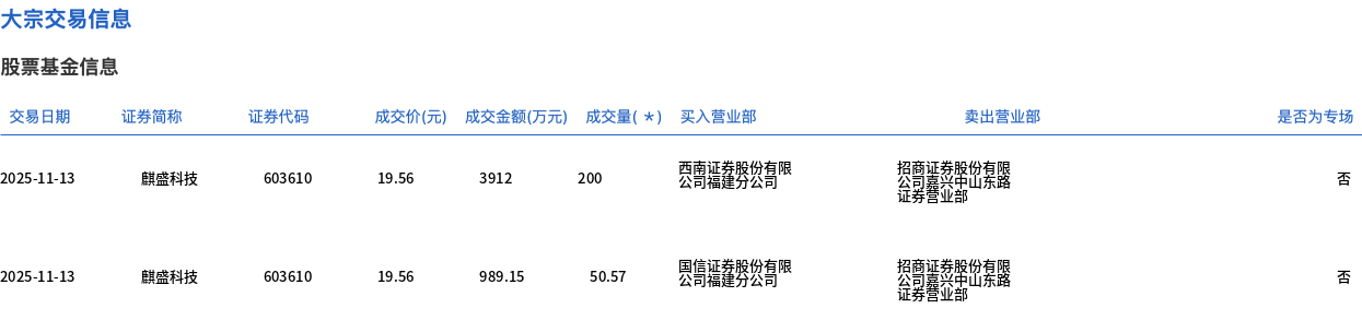 11月13日,麒盛科技大宗交易成交250.57万股,成交额4901.15万元,占当日总成交额的15.24%,成交价19.56元,较市场收盘价20.87元折价6.28%。