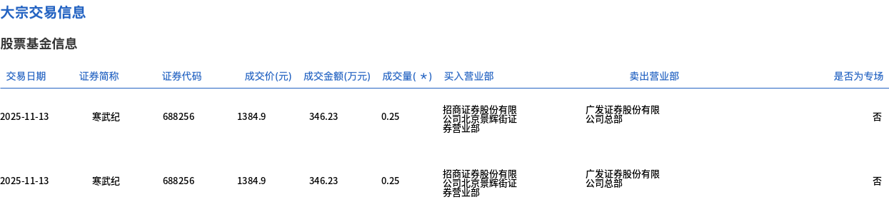 11月13日,寒武纪大宗交易成交5000股,成交额692.46万元,占当日总成交额的0.08%,成交价1384.9元,较市场收盘价1384.9元持平。