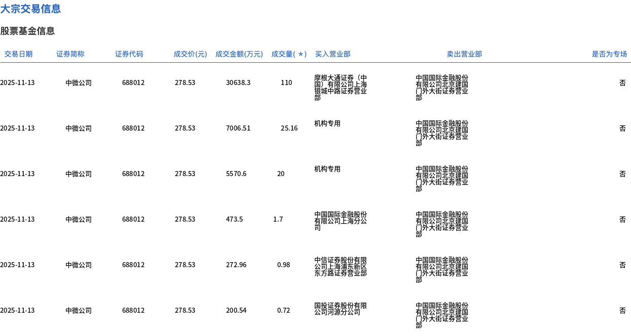 11月13日,中微公司大宗交易成交158.56万股,成交额4.42亿元,占当日总成交额的12.95%,成交价278.53元,较市场收盘价303.52元折价8.23%。