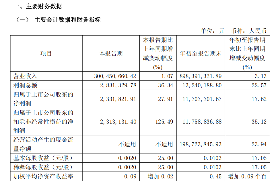按单季度数据看,第三季度营业总收入3.0亿元,同比上升1.07%,第三季度归母净利润233.18万元,同比上升27.91%。