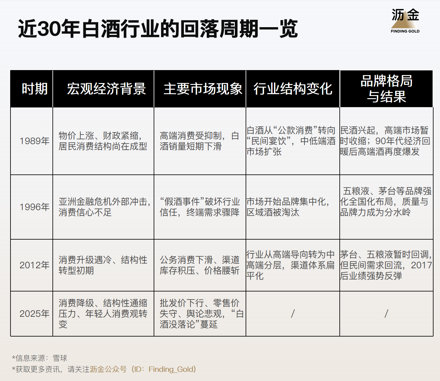 其实早在2013年之前,白酒还经历过两次回落。把当下这次并入计算,新中国成立以来,白酒已经经历四次下行与复苏循环。