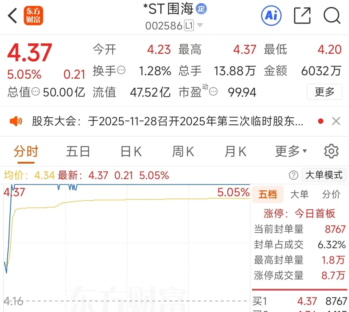 二级市场上,重审判决公告发布当日(11月13日),*ST围海股价涨停,报4.37元/股,最新市值约为50亿元。