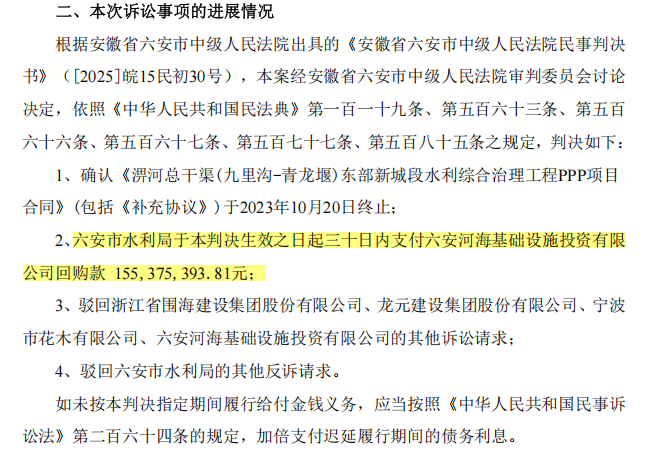 后因合同履行纠纷,公司及六安河海向法院提起诉讼,请求法院判令六安市水利局向六安河海支付回购费用约1.85亿元及回购款利息等相关诉求。