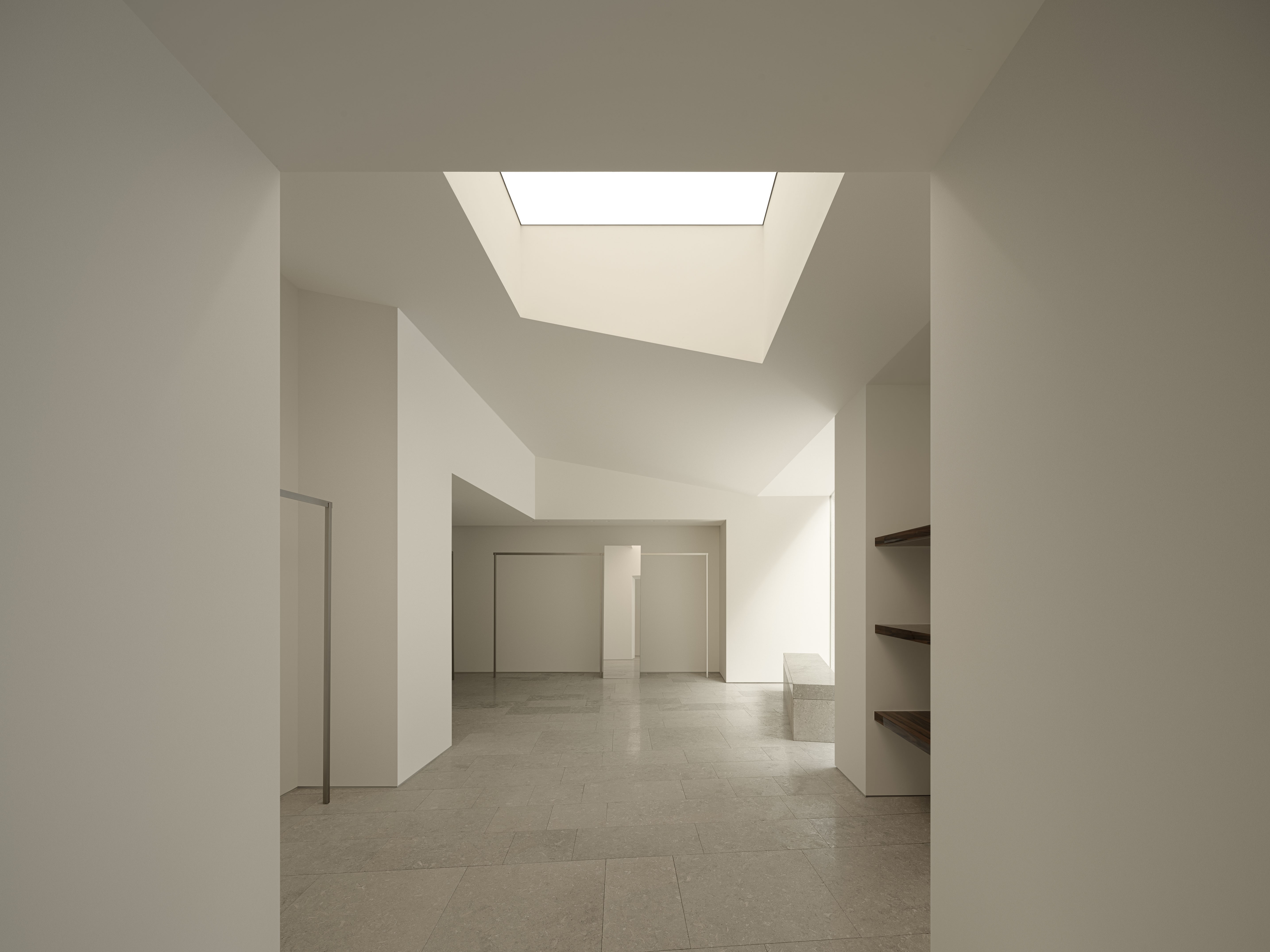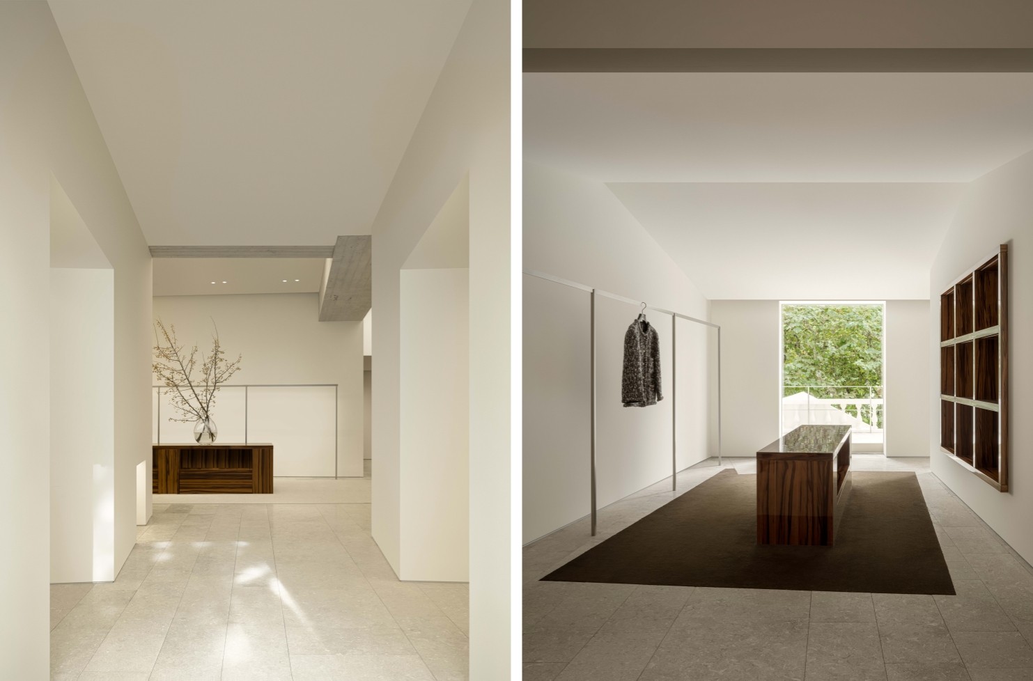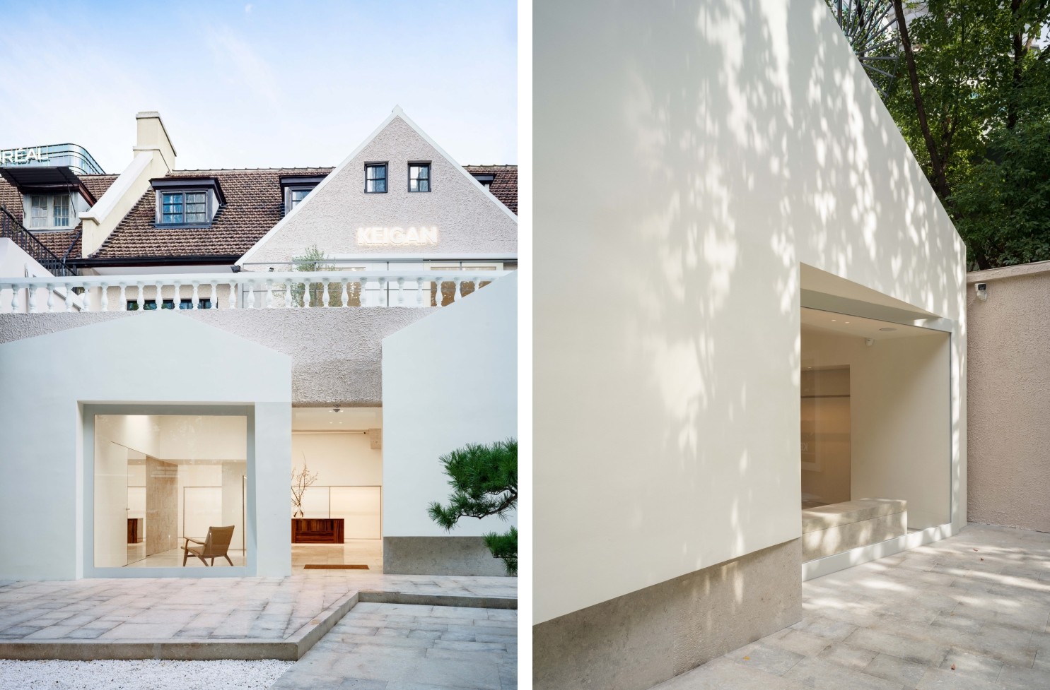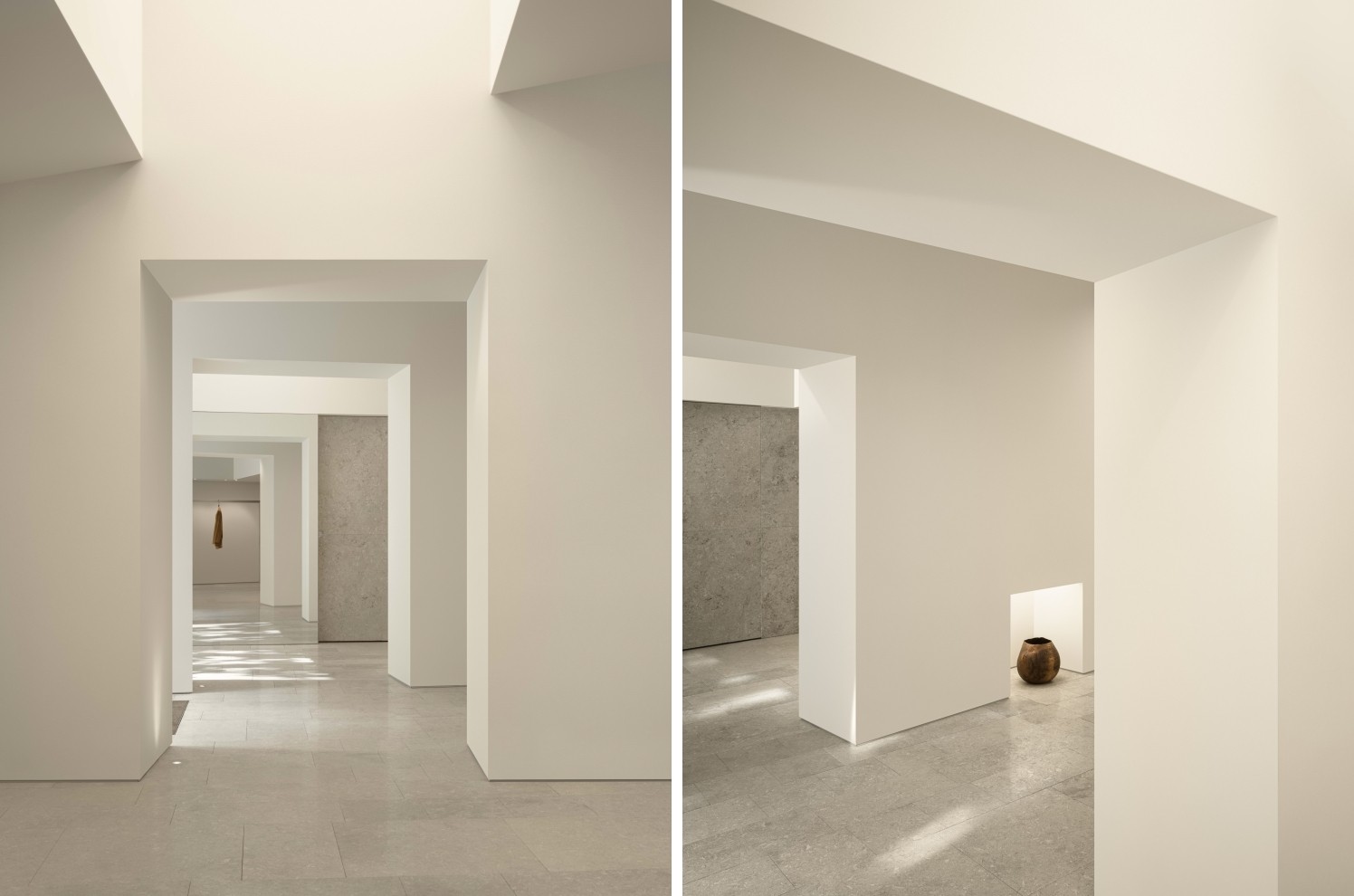 开间KEIGAN携手建筑事务所CHAOS PROGRAMME,以“雕凿的白色房子诠释新建筑空间”, 创造了内与外、 私密和公共、 开放和关闭的空间关系。将自然光影、流动动线与松弛高级的品牌调性相融合。通透的玻璃立面、简约的材质层次与艺术化陈列区域,共同营造出一个大道至简的意境空间,既回应历史,亦对话当代。