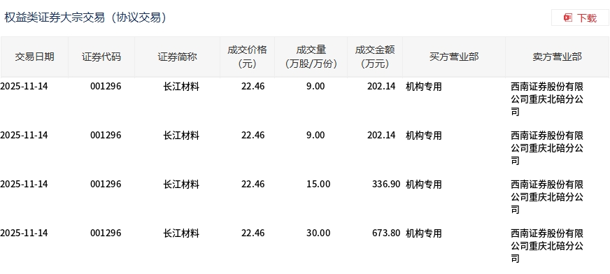 11月14日,长江材料大宗交易成交63万股,成交额1414.98万元,占当日总成交额的12.44%,成交价22.46元,较市场收盘价24.25元折价7.38%。