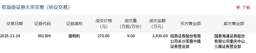 11月14日,德明利大宗交易成交9万股,成交额2430万元,占当日总成交额的0.48%,成交价270元,较市场收盘价270元持平。