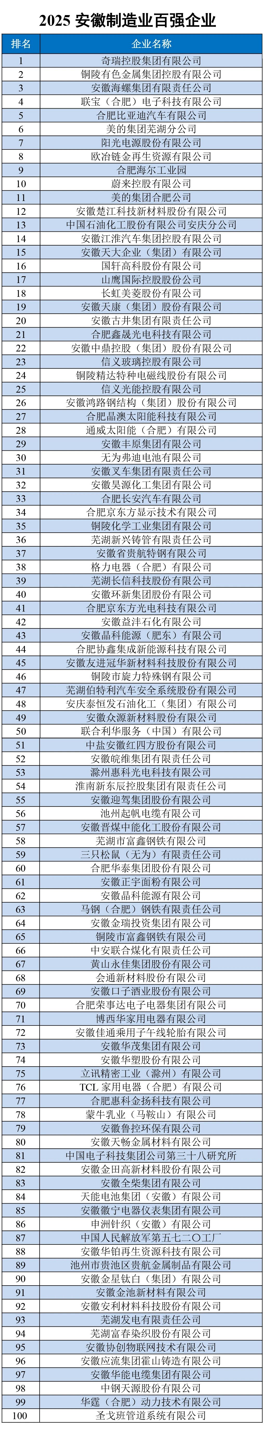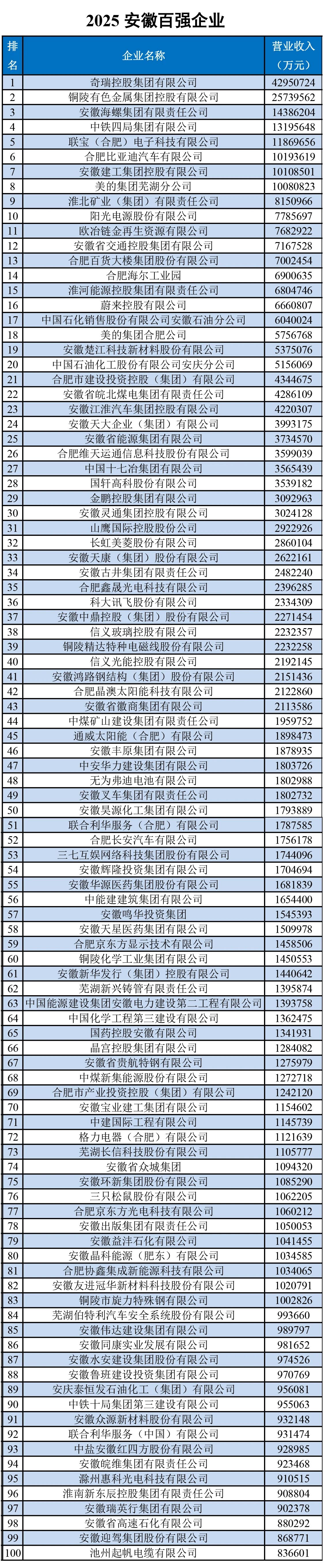其中,奇瑞控股集团有限公司以4295亿元的营业收入分别居2025安徽百强企业、2025安徽制造业百强企业的首位。铜陵有色金属集团控股有限公司、安徽海螺集团有限责任公司分别居第二、三位。