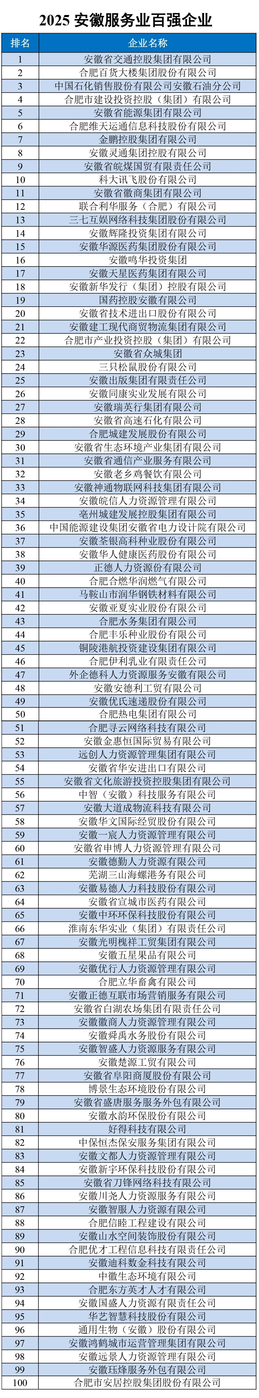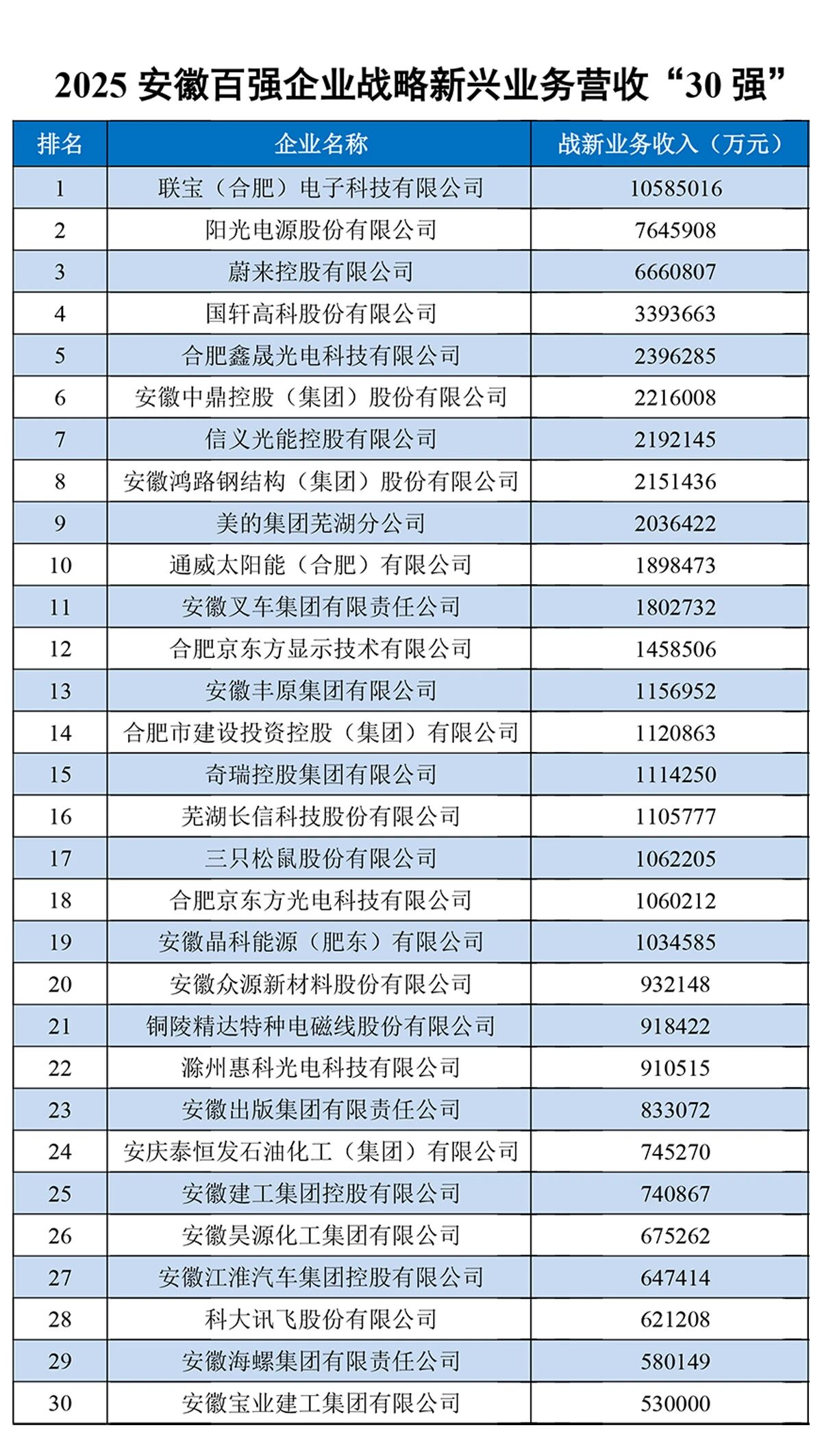 安徽省交通控股集团有限公司、合肥百货大楼集团股份有限公司、中国石化销售股份有限公司安徽石油分公司分别位居2025安徽服务业百强企业榜前三位。今年还特别评选了2025安徽百强企业战略新兴业务营收“30强”,联宝(合肥)电子科技有限公司以1058.5亿元的战略新兴业务收入排名榜首。