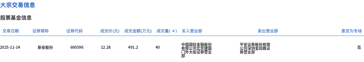 11月14日,新安股份大宗交易成交40万股,成交额491.2万元,占当日总成交额的0.31%,成交价12.28元,较市场收盘价12.28元持平。