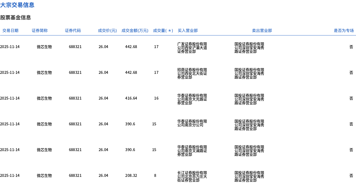11月14日,微芯生物大宗交易成交88万股,成交额2291.52万元,占当日总成交额的6.75%,成交价26.04元,较市场收盘价29.84元折价12.73%。