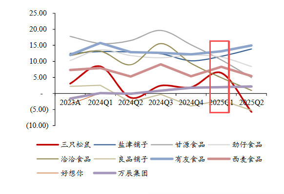 2023A-2025Q2主要休闲食品企业归母净利率