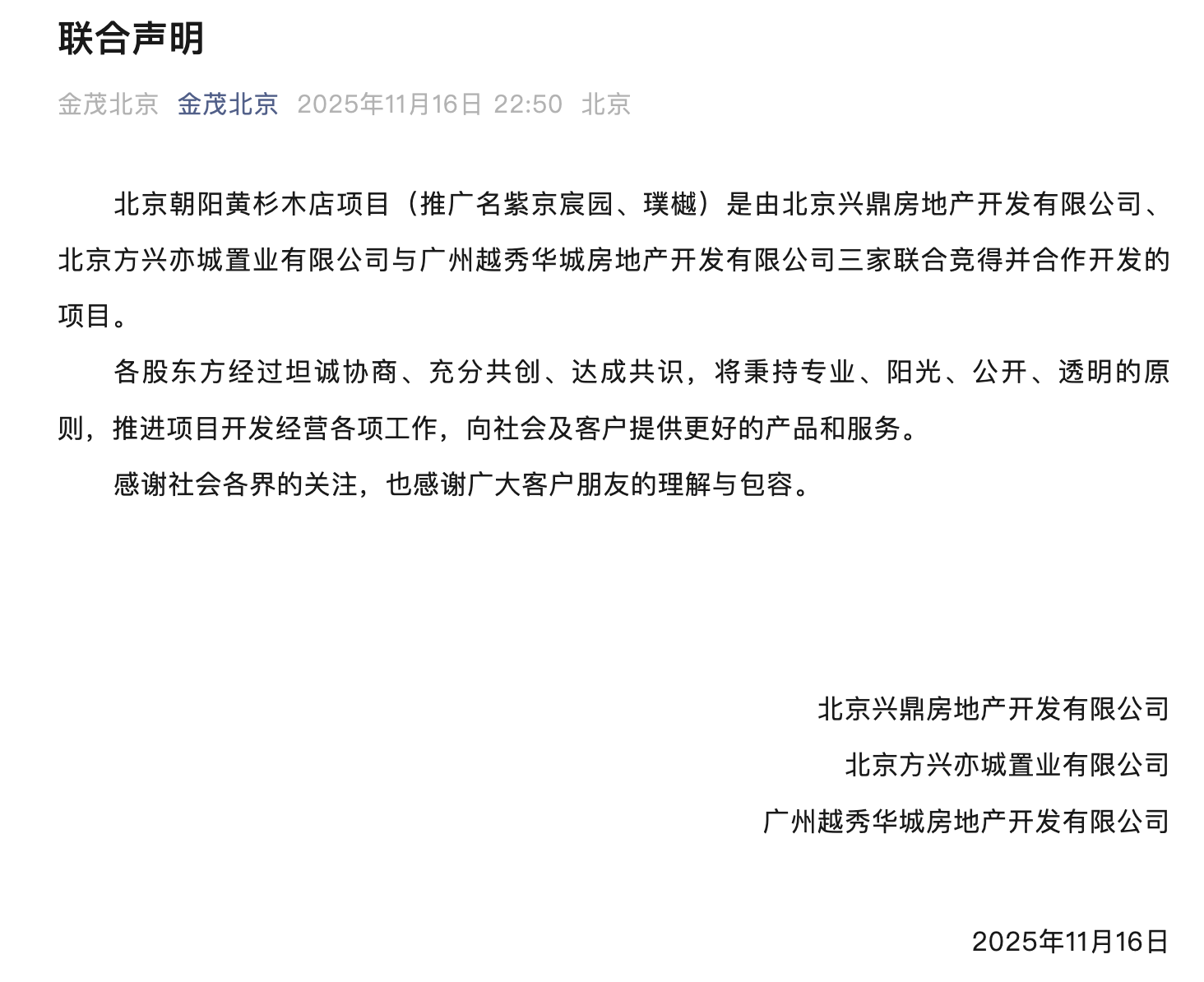 11月16日晚,中建智地、中国金茂、越秀地产发布联合声明称,北京朝阳黄杉木店项目(推广名紫京宸园、璞樾)是由北京兴鼎房地产开发有限公司、北京方兴亦城置业有限公司与广州越秀华城房地产开发有限公司三家联合竞得并合作开发的项目。各股东方经过坦诚协商、充分共创、达成共识,将秉持专业、阳光、公开、透明的原则,推进项目开发经营各项工作,向社会及客户提供更好的产品和服务。