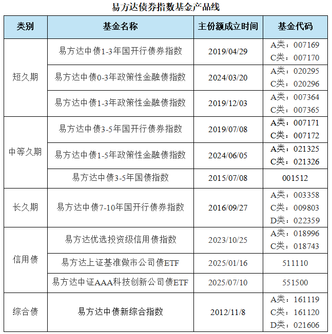目前,经过十余年耕耘布局,易方达旗下已有利率债、信用债及综合债等11只债券指数产品,逐渐实现多品种、全期限覆盖,且均已实现“管理费0.15%/年、托管费0.05%/年”的低费率。
