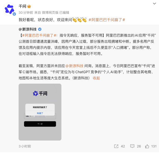 11月17日,有报道称,阿里巴巴新推出的AI应用“千问”公测首日即遭遇流量洪峰,因用户涌入过载,部分服务出现拥堵和中断。随后,“阿里巴巴千问崩了”相关话题冲上微博热搜。对此,阿里千问回应称:“我好着呢,状态良好,欢迎来问。”