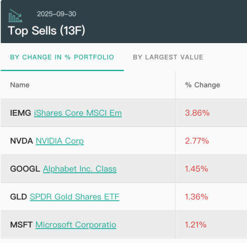 科技股减持比例最高,涉及“Magnificent Seven”中的多家巨头,减持规模占总变化的显著部分。其中,对NVIDIA (NVDA)减持472万股,剩余持仓251万股,而二季度曾加码154%;对Alphabet (GOOGL)减持52.7%,市值减少82亿美元;对Microsoft (MSFT):减持36%,市值减少61亿美元。
