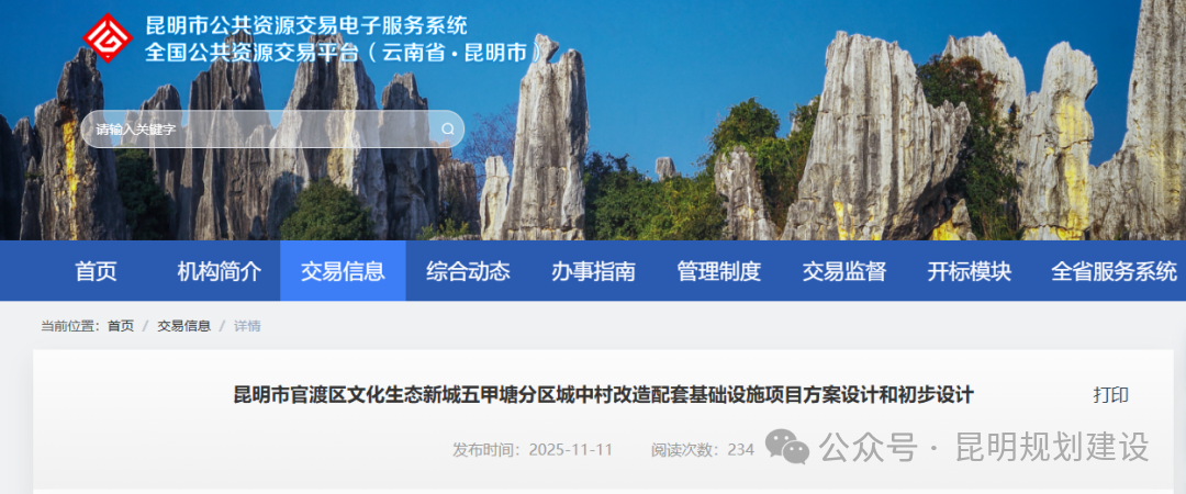 11月11日,云南省公共资源交易信息网发布《昆明市官渡区文化生态新城五甲塘分区城中村改造配套基础设施项目方案设计和初步设计》招标文件预公示。