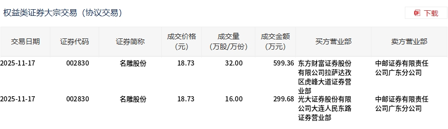 11月17日,名雕股份大宗交易成交48万股,成交额899.04万元,占当日总成交额的6.51%,成交价18.73元,较市场收盘价19.02元折价1.52%。