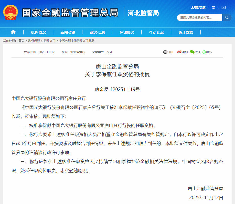 据国家金融监督管理总局河北监管局的批复文件显示,唐山金融监管分局核准李保献光大银行唐山分行行长的任职资格。