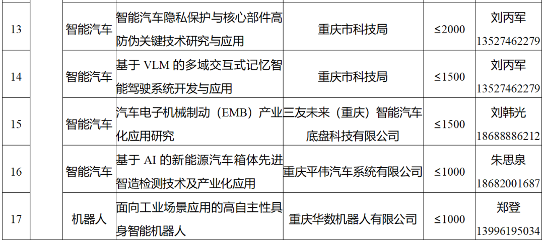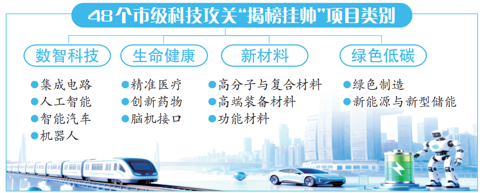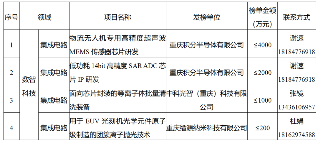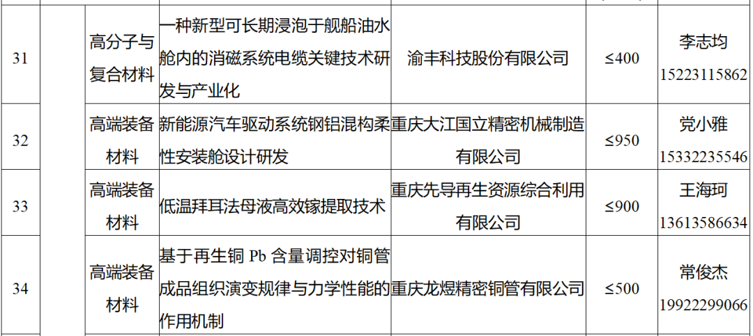 “重庆发布”微信公众号11月18日消息,日前,重庆市经济信息委与市科技局联合公布48个市级科技攻关“揭榜挂帅”项目,重点围绕重庆市“33618”现代制造业集群体系建设和“416”科技创新布局展开,涉及4个类别、12个重点产业领域。累计发榜金额将超3亿元,其中,经费在500万元以上的重大项目有26个,500万元以下的重点项目有22个。这批“揭榜挂帅”项目来自数智科技、生命健康、新材料和绿色低碳四个类别,每个项目本身都涉及相应的新兴产业领域。