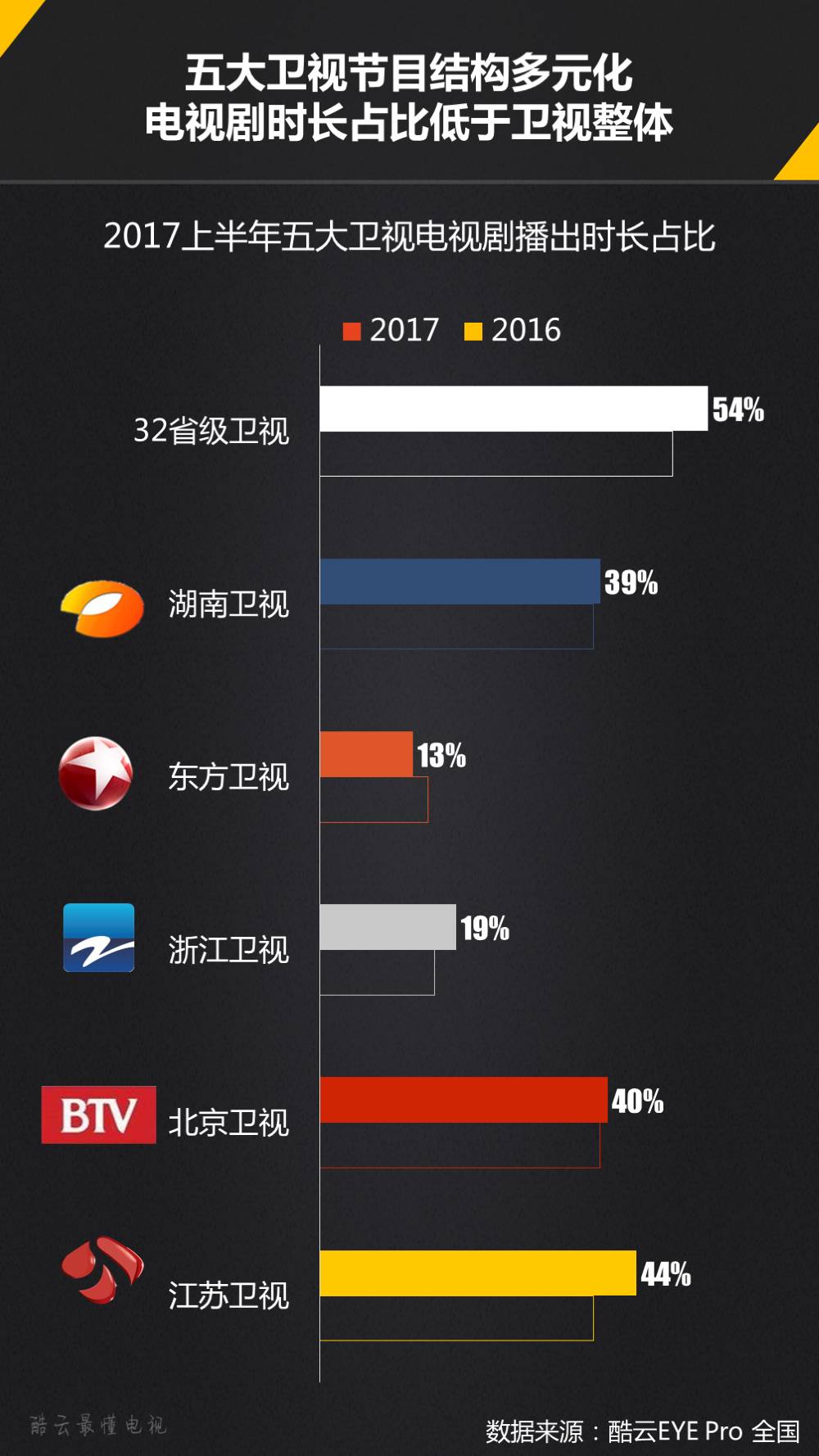 2017上半年省级卫视整体电视剧播出时长占比54%,关注度前五卫视节目结构更为多元化,电视剧时长占比均低于卫视整体。其中东方、浙江卫视电视剧比重最低,不足20%;湖南、北京、江苏卫视电视剧时长占比都在40%左右。五大卫视中湖南、浙江、北京、江苏卫视电视剧时长同比均有上升,江苏卫视增幅最大。