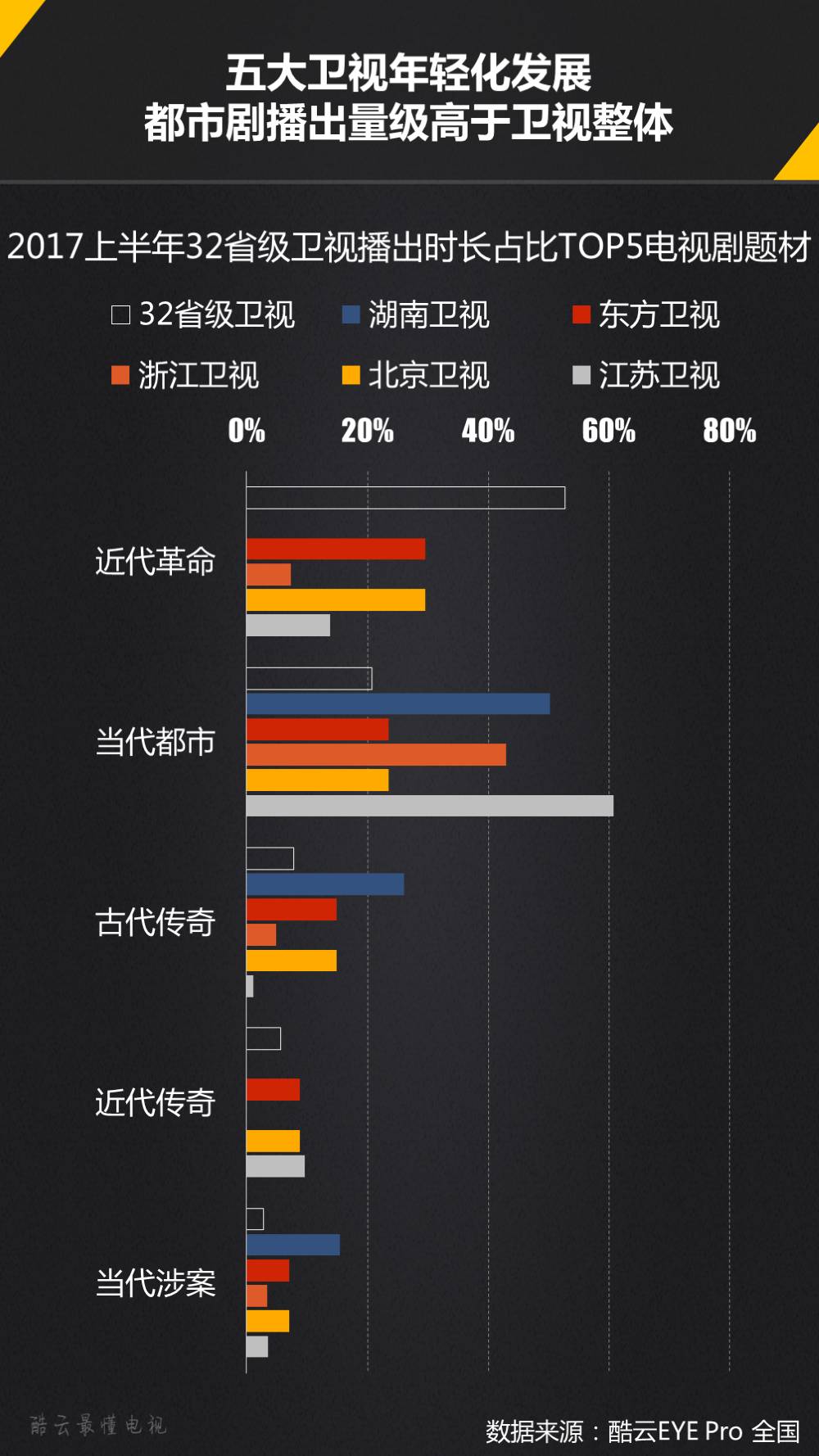 五大卫视更侧重都市剧,湖南、浙江、江苏都市剧比重超过40%。