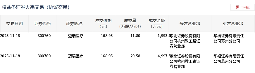 11月18日,迈瑞医疗大宗交易成交41.38万股,成交额6991.15万元,占当日总成交额的7.86%,成交价168.95元,较市场收盘价206.71元折价18.27%。