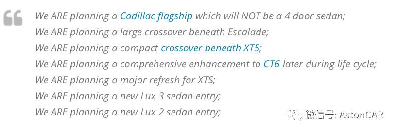 按照凯迪拉克的计划,2020年前将推出的10款全新车型,CT6和XT5只是一个开始。根据2016年Johan De Nysschen的公开发言,凯迪拉克还会在CT6之上推出一款双门旗舰车型,而紧凑级SUV——XT3也会在2018年推出。另外,在LUX3和LUX2级别里各推出一款新车,如此看来,在凯迪拉克的规划里,似乎已经看不到XTS的位置。