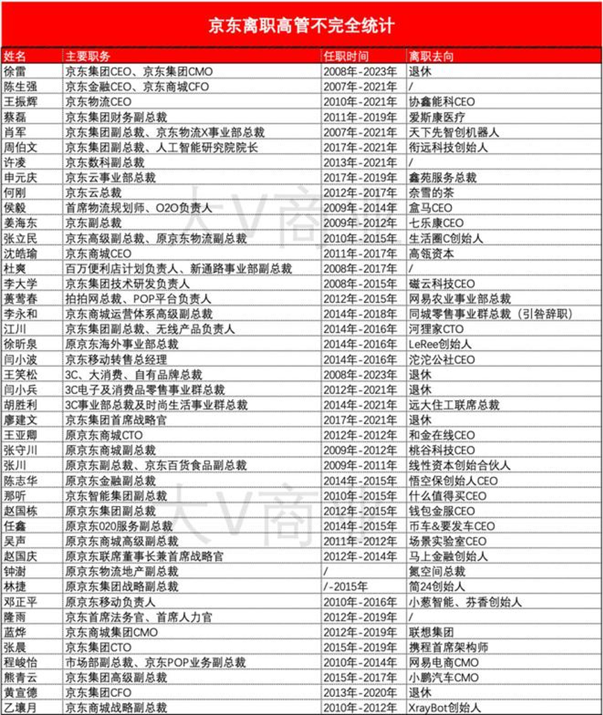 (京东2023年前离开的高管,大V商业根据公开资料整理)