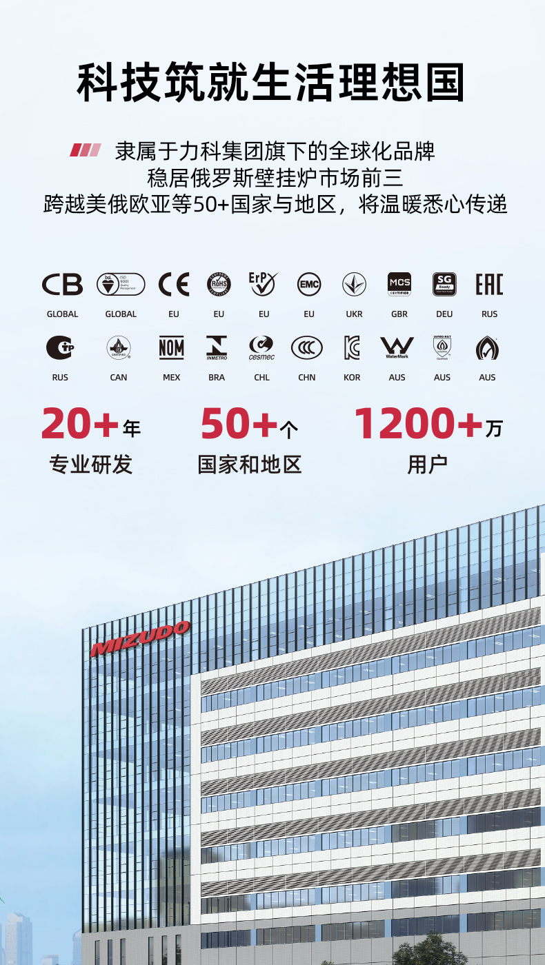 背靠集团强大研发积淀,MIZUDO 组建了60余人的顶尖工程师团队,斩获数百项国内外专利。其核心产品MT1系列壁挂炉,凭借精简结构设计与稳定运行性能,成为全球家庭的信赖之选。从俄罗斯市场稳居前三的销量佳绩,到欧盟 CE、北美ETL等国际认证加持,MIZUDO 以硬核实力诠释 "科技筑就生活理想国" 的品牌理念。