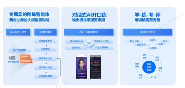 中关村科金基于自研的领域大模型与语音交互技术,为该银行量身打造了“学—练—考—评”四位一体的智能陪练方案,构建覆盖全岗位、全场景的沉浸式培训体系。