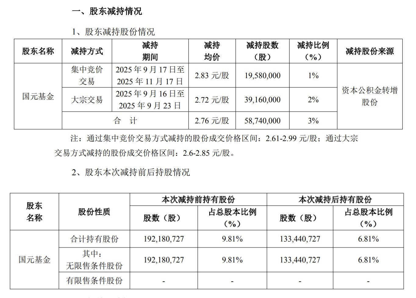 但实际执行节奏快于预期。公告显示,国元基金通过集中竞价交易减持1958万股,占比1%,均价2.83元/股;通过大宗交易减持3916万股,占比2%,均价2.72元/股。