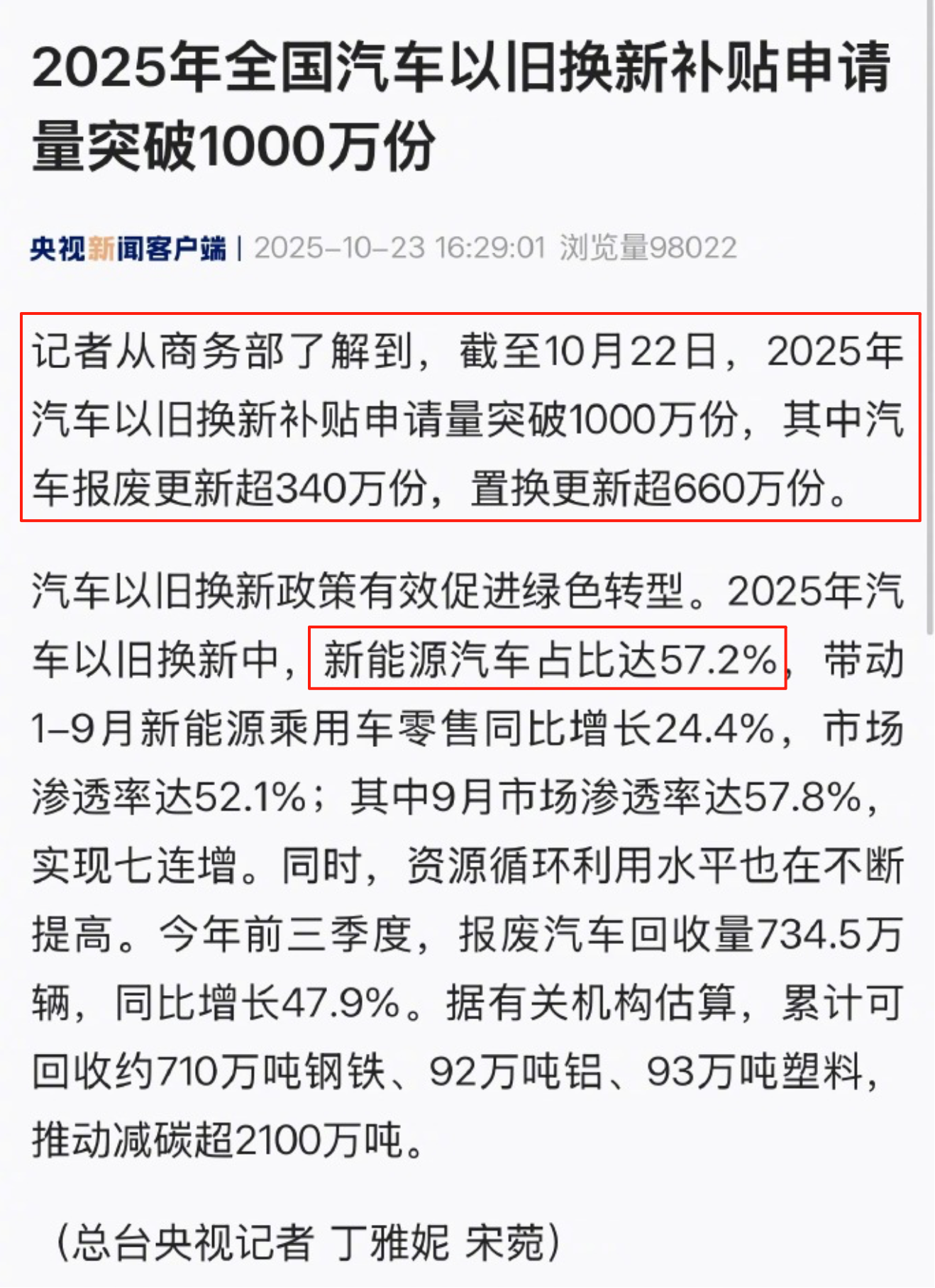 商务部数据显示,截至10月22日,2025年以旧换新的超1000万份申请量中,汽车报废更新超340万份,置换更新超660万份,新能源车占了其中的57.2%。