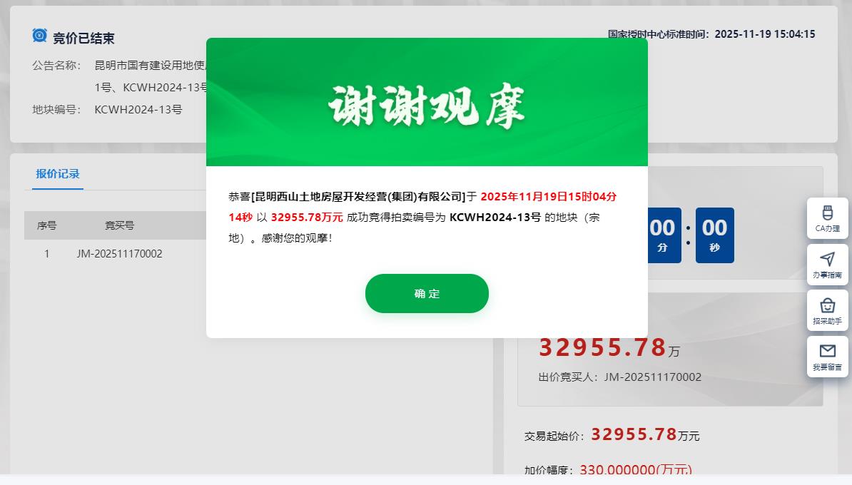2025年11月19日,昆明2宗地合约29.73亩均底价成交。其中,一二一TOD项目最终被浙江义承集团成功斩获,住宅地块成交楼面价高达10130.53元/㎡。