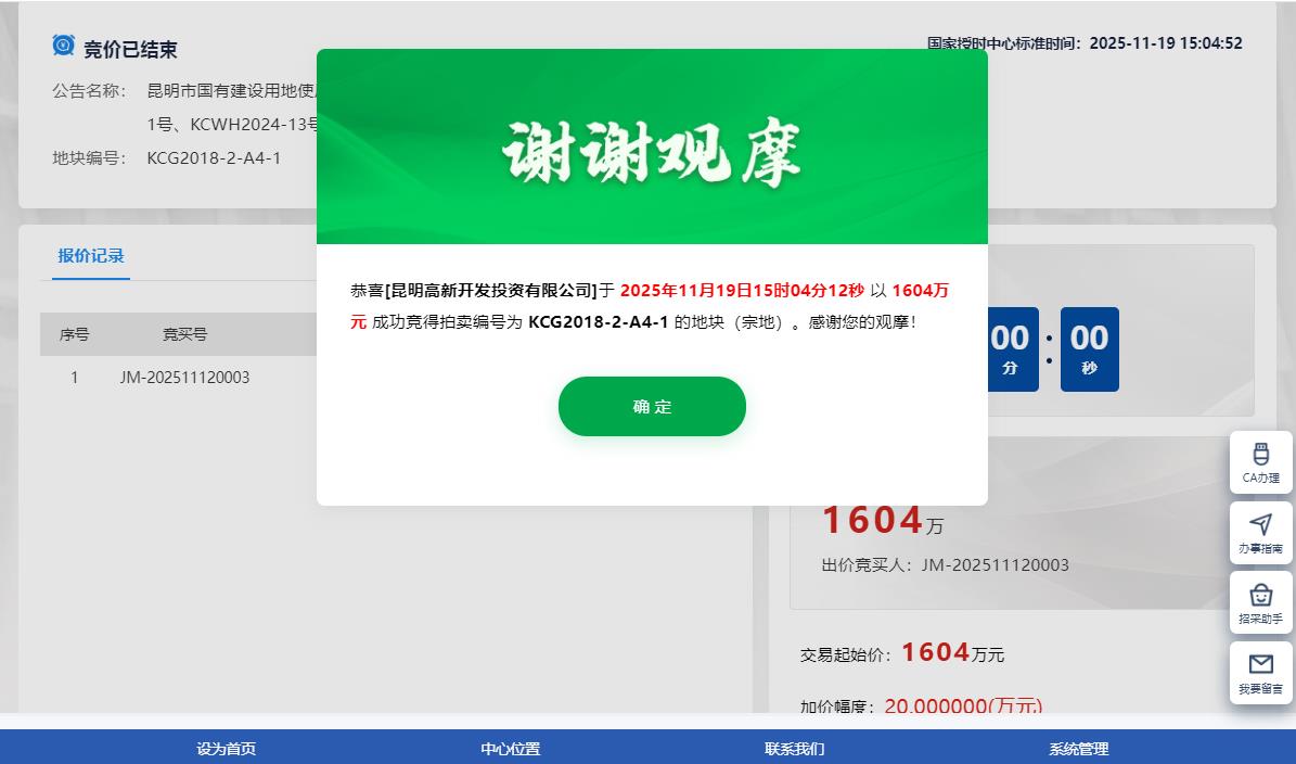 另一宗地块位于马金铺片区,编号为KCG2018-2-A4-1号地块,最终被昆明高新区开发管委会旗下平台公司昆明高新开发投资有限公司,以1604万元的底价收入囊中。净用地面积5346.52㎡,合约8.02亩,成交楼面价约562元/㎡,单价为200万元/亩。