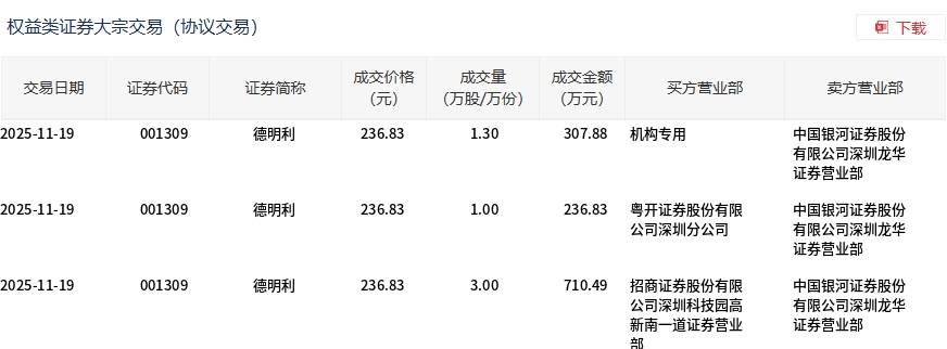 11月19日,德明利大宗交易成交5.3万股,成交额1255.2万元,占当日总成交额的0.31%,成交价236.83元,较市场收盘价263.71元折价10.19%。