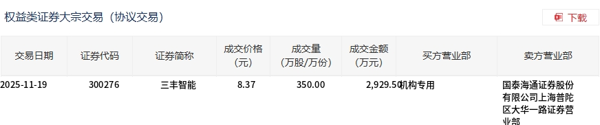 三丰智能今日大宗交易折价成交350万股,成交额2929.5万元