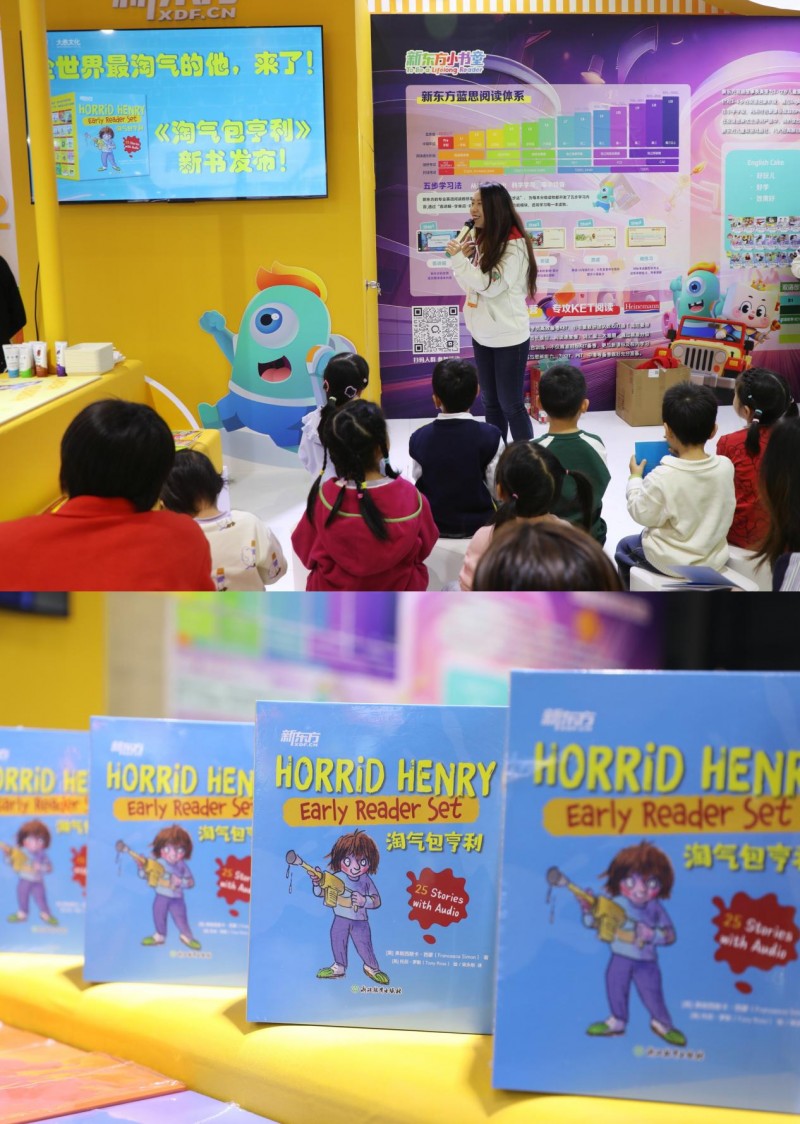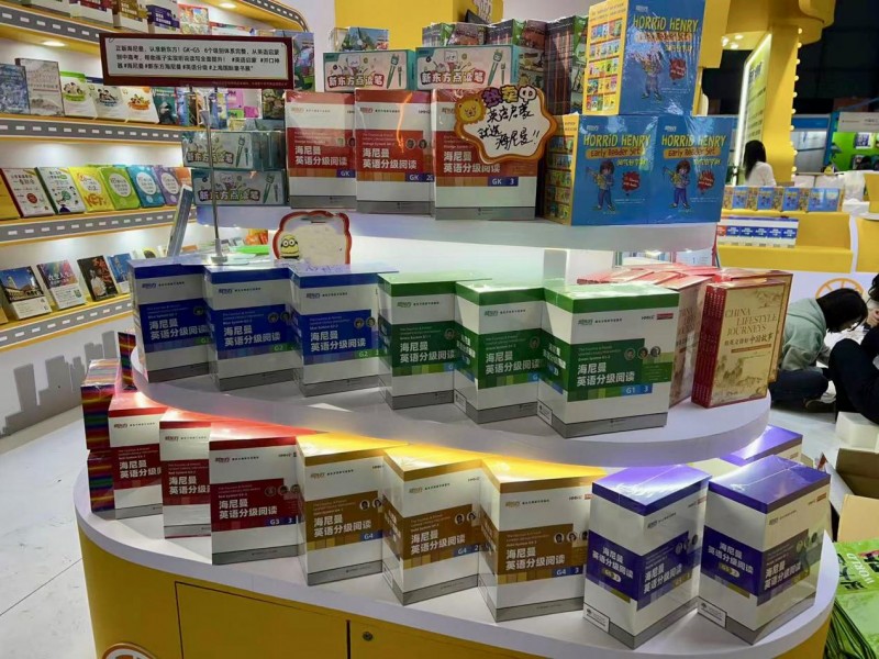 进入新东方大愚文化的展台,首先吸引目光的是由新东方完整引进国内的知名分级读物——《海尼曼英语分级阅读》。该系列凭借独有的LLI介入式阅读体系、朗朗上口的重复句式、合理的虚构与非虚构内容配比,已迅速成为国内家庭英语启蒙首选。展台上醒目的海尼曼套盒,吸引孩子们纷纷驻足,现场不时回荡起孩子们清朗悦耳的英文读书声。