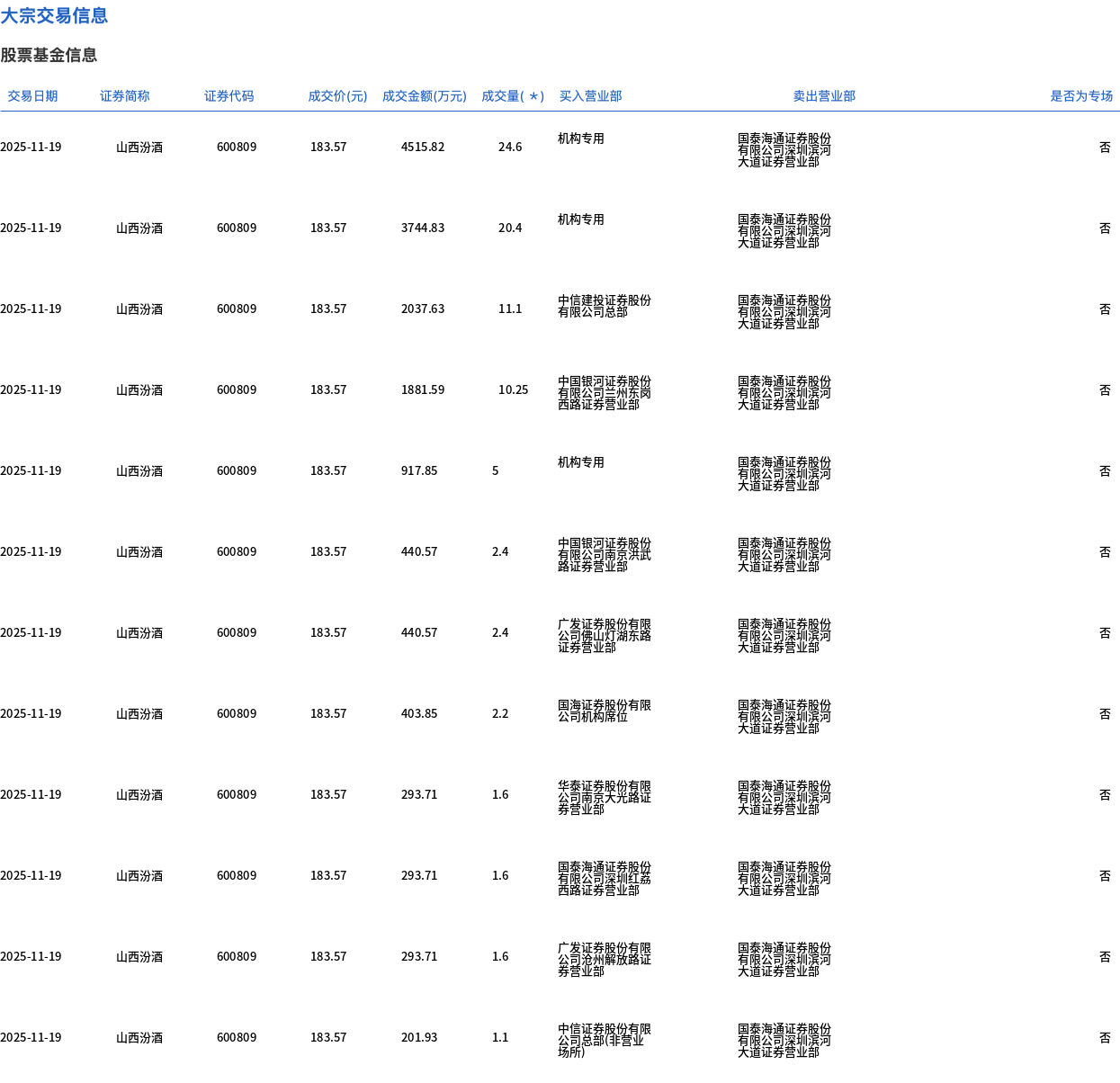 山西汾酒今日大宗交易折价成交84.25万股,成交额1.55亿元