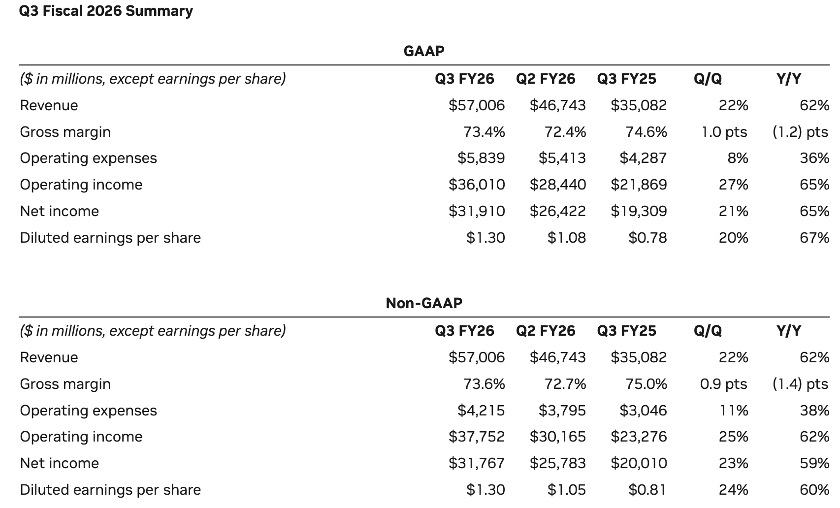 美东时间11月19日美股盘后,英伟达公布了2026财年第三财季财务数据。财报显示,英伟达第三财季实现创纪录的570亿美元营收,同比增长62%,大幅高于市场预期的551.9亿美元;净利润为319亿美元,同比大涨65%;经调整后的每股收益为1.30美元,高于市场预期的1.25美元。这一业绩表现再次强化了英伟达在AI领域的话语权。