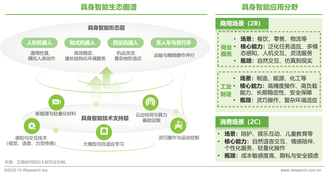 不同形态的具身智能机器人正并行演进,满足零售、餐饮、工厂、物流、教育、医疗等场景需求。商用具身智能服务于零售、餐饮、医疗、安防等复杂动态环境,更依赖多模态感知、人机交互和泛化能力,旨在提升服务体验与灵活运营。工业具身智能主要面向制造、能源、矿山等高度结构化场景,强调高精度、高负载和长周期稳定性,目标是提升效率与保障安全。两者在能力要求与技能瓶颈上差异较大,但正共同推动具身智能于不同维度的落地发展。