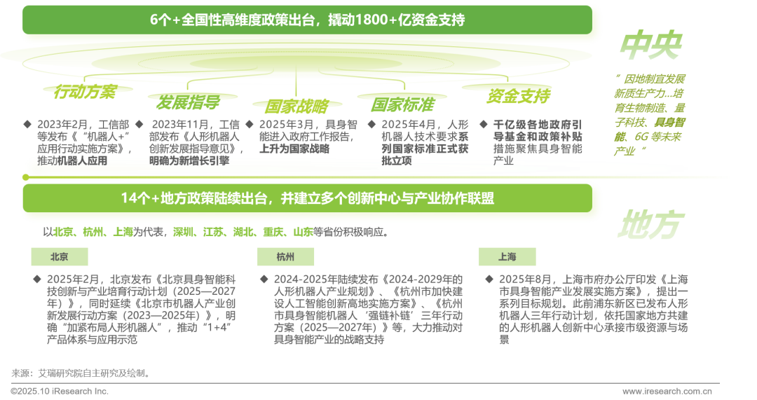 近两年来,中国将具身智能纳入国家战略,中央层面密集出台行动方案、发展指导意见与资金支持,强调技术攻关、产业链协同和场景开放。与此同时,地方政府也陆续发布专项规划和试点示范举措,出台多种政策支持产业发展,设立基金为人形机器人/具身智能企业提供资金,并建立机构/联盟以促进产业合作,推动行业加速发展。