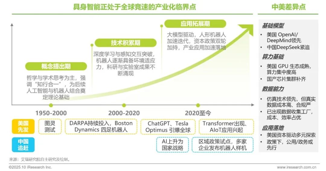 具身智能的发展历程可分为三个阶段:从1950年起的哲学思辨与概念萌芽,到2000–2020年的技术积累期,再到2020年以来的大模型驱动与应用拓展期。全球进入快速演进的新拐点,美国凭借算力基础、顶尖模型与资本生态实现先发优势;中国则依托政策支持、场景驱动与产业链协同加速追赶,形成本土特色里程碑。未来五年,中美将在基础模型、算力和应用落地上比拼,各自路径和优势也将进一步显现。
