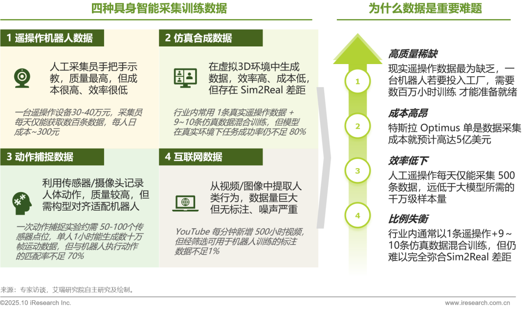 当前具身智能领域的数据获取主要依赖四种方式:遥操作、仿真合成、动作捕捉以及互联网视频图像。尽管路径多样,但真正推动模型泛化落地的高质量数据依然高度稀缺,导致数据成为行业发展的关键瓶颈。