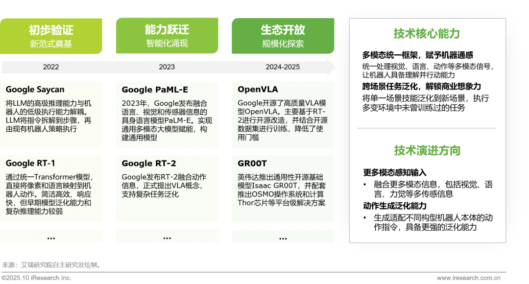 在大语言模型成熟之后,具身智能模型正经历在端到端的范式演进,核心主线是:通过多模态统一框架,将大型语言模型的推理能力与真实世界的感知、行动能力深度融合,催生出能够跨场景、自主学习的“机器人大脑”。这一进程早期由谷歌等巨头引领,并随着英伟达以及新进入者的入局和开源模式的兴起而加速,逼近类似GPT-3智能爆发的临界点。
