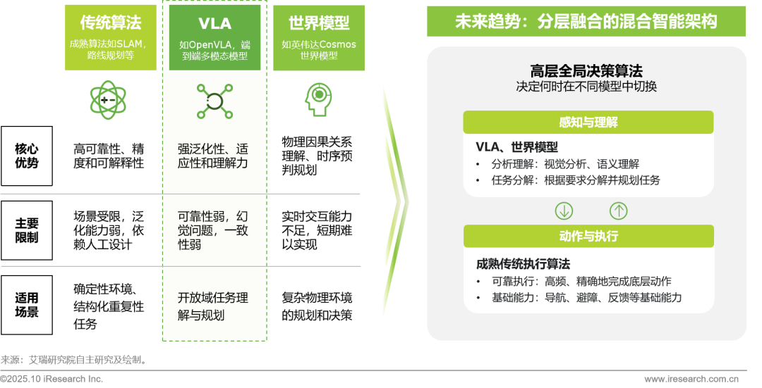 传统成熟算法如SLAM等安全可靠,但缺乏泛化能力,而VLA和世界模型通用性更高但存在幻觉等问题,因此混合模型架构,取长补短是必然趋势。行业共识是通过高层大模型进行认知、理解与规划,同时结合底层成熟算法实现可靠、精准的执行。这种“大脑”与“小脑”协同的模式,兼顾了智能的泛化性与任务的可靠性,是推动具身智能从实验室走向规模化商业应用的关键。