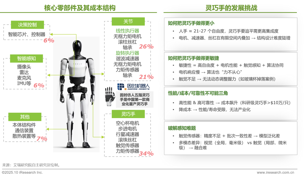 灵巧手也是亟需突破的关键环节,特别是应用落地难度最大的家庭场景。它既是实现人机交互与精细操作的核心部件,又因小型化设计、敏捷控制和成本可靠性“三难困境”而备受关注,是核心部件中技术、工艺难度最大的环节。