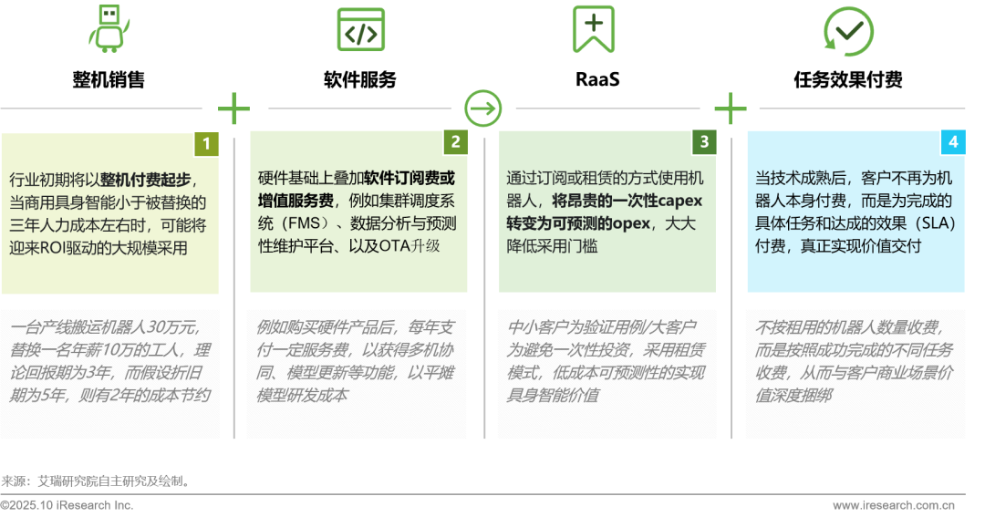 一次性整机销售是目前具身智能主要的商业模式,同时辅以部分的软件服务销售。展望未来,具身智能的商业模式可能将从传统的纯硬件整机销售,逐步演进为降低客户前期投入的“机器人即服务(RaaS)”模式,最终发展至与客户业务价值深度绑定的“按任务完成效果付费”新阶段。