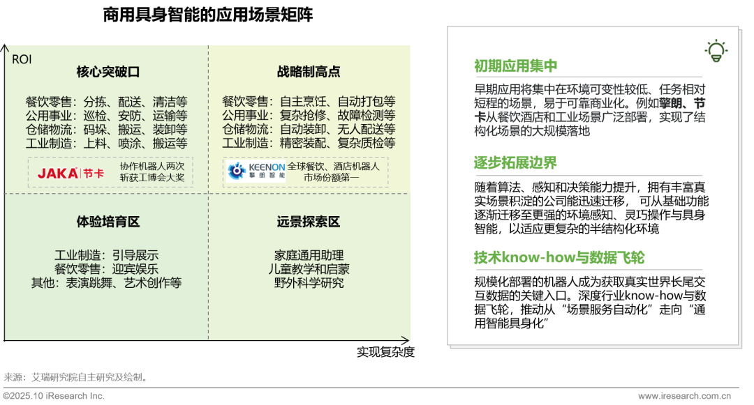 具身智能的商业化正沿着价值阶梯演进。当前,产业应用以高ROI、低复杂度的“确定性”场景为核心突破口,如工业制造、仓储自动化和餐饮零售的基础场景正迎来订单加速释放期。未来,随着技术成熟度提升,应用将向高复杂度、高价值的“战略性”场景渗透,最终实现通用化服务,开启更广阔的市场空间。