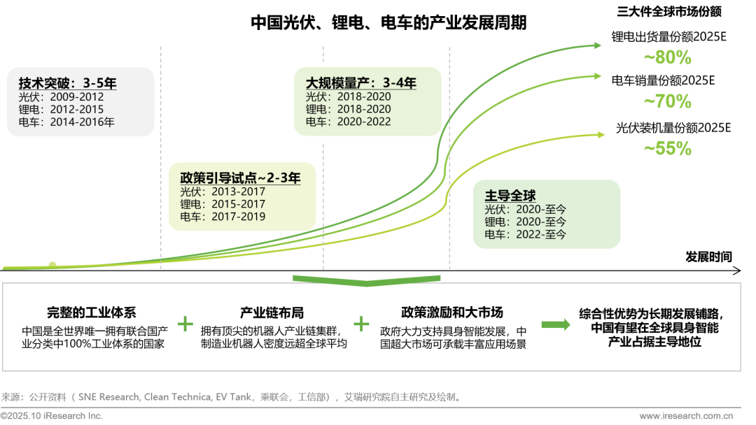 今天中国的光伏、锂电、电车三大万亿市场,放眼全球用遥遥领先不为过,但回顾发展历史,也经历多次产业周期和过剩淘汰的惨痛教训。中国已拥有机器人领域最完备、成本最有优势的工业体系和供应链,以及最大的应用市场。国内具身智能或许也会面临短暂瓶颈期,但循序渐进、久久为功,终将不断突破。
